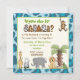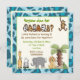 Convite de festas de safari dos animais da selva-coroa, com alguns animais da selva: leão, girafa, elefante, zebra, macaco, cobra, palmeira e a palavra SAFARI em letras padronizadas com padrões de impressão animal. Há um quadro de impressão do leopardo azul ao seu redor e um tigre no verso. Um adorável excelente design para festas de aniversário infantil, rapazes e raparigas. Esquema de cores: castanho, amarelo, cinza, verde, preto, branco, azul.