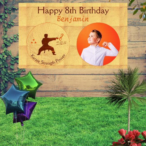A força das artes marciais aparecia em um design de caratê moderno com nome personalizado em laranja queimado e fundo dourado simbolizando medalhas de ouro caratê. Personalize a idade, o nome e todos os detalhes do convite perfeito para o aniversário.