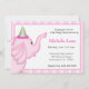 Um belo convite de aniversário para elefantes cor-de-rosa com um elefante vestindo um chapéu cor-de-rosa. Excelente de aniversário para uma garota.