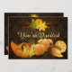 Este belo convite de aniversário de colheita de outono de ouro apresenta um peru, abóboras, flores e uma bela cornucopia cheia de flores de milho, gourdes e outras delícias de outono com fundo Damask em tons de marrom. É uma escolha excelente para aniversários que são mantidos perto ou durante o feriado de Ação de Graças.
