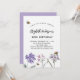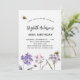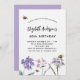 Um fundo branco. Decorado com abelhas e pintado flores silvestres em violeta e rosa. Personalize e adicione um nome e detalhes da parte.
