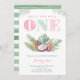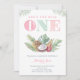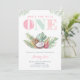 folhas de aquarela tropical e frutas adornam este convite de primeiro aniversário para a pequena coletora de conchas livres em sua vida
