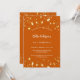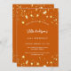 Um fundo laranja queimado decorado com estrelas ouros. Personalize e adicione um nome e detalhes da parte. O nome é escrito com um script de estilo manuscrito, letras brancas coloridas.