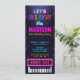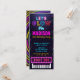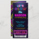 Celebre sua festa de aniversário com nosso convite para ingresso Neon Glow. Passagem de tíquete Apresenta texto baixo do vamos futurista sobre fundo escuro. Este design de moda é perfeito para discoteca roller ou festa brilhante.