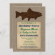 Um charmoso convite à pesca russa, ele estiva um fundo de burlap, peixe marrom no topo e uma caixa de texto vintage shabby com texto verde e azul marinho. Este convite para festas de aniversário de pescador rústico e divertido será um grande sucesso.