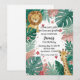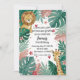 Celebre um primeiro aniversário especial com esses adoráveis animais da selva em aquarela. Este doce design apresenta um leão e uma girafa espiando através de folhas e flores tropicais em tons suaves de rosa e verde. Perfeito para o convite ou decoração de uma festa temática de selva ou safari para uma menina.