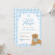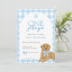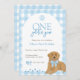 Comemore o primeiro aniversário do seu filho com este convite de aniversário de um Ouro. Este adorável convite apresenta gingham azul, um recuperador de ouros vestindo um arco azul, e estampas de pata lúdicas. Perfeito para famílias que amam o cão, esta doce design adiciona um toque encantador a qualquer primeira festa de aniversário.
