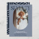 Convite de aniversário para 70 de na moda moderno. Design apresenta uma fotografia oval da aniversariante/rapaz, a elegante inscrição 'SÉTICA' com o nome das pessoas no script de assinatura no topo e um simples modelo de festa de aniversário que é fácil de personalizar com os seus próprios detalhes. As cores também podem ser alteradas para corresponder à decoração do seu próprio partido.