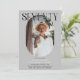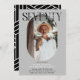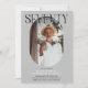 Convite de aniversário para 70 de na moda moderno. Design apresenta uma fotografia oval da aniversariante/rapaz, a elegante inscrição 'SÉTICA' com o nome das pessoas no script de assinatura no topo e um simples modelo de festa de aniversário que é fácil de personalizar com os seus próprios detalhes. As cores também podem ser alteradas para corresponder à decoração do seu próprio partido.