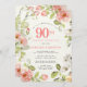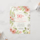 Lindas flores cor-de-rosa e brancas estão coladas em folhas verdes. 90 é escrito em grandes números cor-de-rosa. Um quadro ousado e moderno envolve o texto.