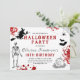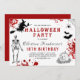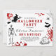 Convite de aniversário de Halloween, que inclui espinhos de sangue, um esqueleto, abóbora, morcegos, aranha e teia, e uma bruxa/gato sobre uma vassoura, todos colocados num fundo branco clássico com um modelo de convite fácil de personalizar.