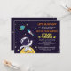 Convite de festa de aniversário com fundo azul escuro com estrelas amarelas espalhadas. Sobreposto está uma ilustração de um astronauta vestindo um traje espacial branco flutuando acima da lua. Ao longe está um planeta com anéis e uma nave espacial voando pelo céu em busca de novos mundos para explorar
