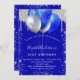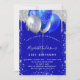 Um fundo azul real. Decorado com falso brilho prateado pingando o aspecto de pingar tinta, faíscas e balões. Personalize e adicione um nome e detalhes da parte. O nome é escrito com um script de estilo manuscrito.