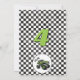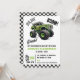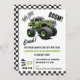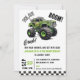 Convite de aniversário temático de caminhão monstro para menino, apresentando um caminhão verde, bandeiras de corrida e padrão de xadrez. Pode ser usado para qualquer idade.