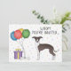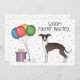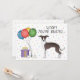 Design do tema de aniversário bonito com a ilustração original de Destei de um selo bonito e de um cão italiano de raça Greyhound/Iggy. Ao lado do cão há balões coloridos de aniversário amarrados num osso de cão e uma caixa de cor roxa e amarela. O fundo tem um padrão lúgubre de confete pastel colorido sobre um fundo branco. Personalize as áreas de texto de exemplo com os detalhes do seu evento.