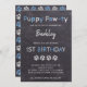 Pawty! Tenha seu aniversário de cachorros com este simples cartão de convite para anúncio de design de páginas e slate.