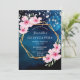 Uma floral tropical sob as estrelas Quinceañera, 15 (ou qualquer idade) convite de aniversário com flores de hibisco cor-de-rosa, verde-verde e uma falsa estrutura geométrica dourada. Um céu azul escuro com lua de cheio e estrelas como fundo. Modelos para um nome escrito com um script de estilo manuscrito moderno, modelos para suas informações de partido. Texto branco. Perfeito para uma festa de verão, piscina ou praia! Verso: céu azul e estrelas como fundo.