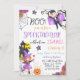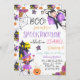 Cale-se com o nosso convite de aniversário de Dia de Halloween, Rosa Púrpura, Spooktacular! Este convite encantador é perfeito para uma festa de fantasia de Halloween de uma menina, com um belo feiticeiro, abóboras brincalhões, morcegos assustadores e um fantasma amigável, todos colocados num pano de fundo roxo e rosa vibrante. Ideal para um aniversário de Halloween cheio de diversão, este convite captura o espírito festivo com sua mistura de detalhes assustadores e charmosos. BRT114