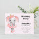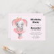 Convite de aniversário com uma ilustração adorável. Um elefante de menina cinza com tutu rosa e balé de dança de flores, na ponta.