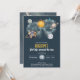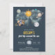 Celebre o marco especial do seu filho com este convite de aniversário de tema do espaço sideral mágico. Apresentando planetas imaginários, luas e estrelas em marinho e mira dourada. Estas estrelas de galáxia solar e planetas são perfeitas para uma festa de aniversário simples. O moderno design whimsical mostra um fundo de marinho-azul-aquarela adornado com um sol vibrante amarelo, lua de cinza sorridente, planetas de cor pastel e estrelas de brilho dourado dispersas.