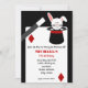 Um convite do aniversário para as crianças que caracterizam uma ilustração de um coelho que sai de um chapéu alto no direito superior. Varinha mágica na esquerda. Personalize o texto vermelho e preto sobre o cartão de jogo com detalhes de sua ocasião.