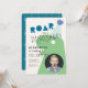 Este simples e fofo "rugido como um convite de aniversário de um dinossauro" mostra sua foto e um fundo branco creme com t-rex / tiranossauro rex / dinossauro com um chapéu azul-claro. O verso apresenta um fundo azul marinho com padrões de seta branca. Altere a cor de fundo e personalize para suas necessidades. Você pode encontrar mais produtos correspondentes na minha loja.