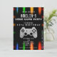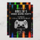 Video Game Party Controller Neon Gaming Convite de Aniversário. Controladora de jogos em uma luz néon vívida e colorida sobre um fundo preto.