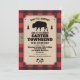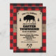 Um fundo de xadrez de búfalo vermelho contrasta com um painel de aparência de papel kraft preso por uma pulseira de burlap. O painel guarda as informações da festa e um bison anda entre dois pinheiros. Os eixos cruzados fazem um logotipo personalizado na parte inferior do painel. Excelente para uma festa rústica, ocidental, noroeste, ou de lumberjack para o aniversário de um adulto ou criança. Disponível com produtos correspondentes.