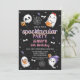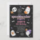 Festa Spooktacular de Aniversário do Black Ghosts Halloween Convite para o aniversário de 3 fantasmas bonitos, um scull, doces, ossos e alguns itens de brilho prateado em um fundo quase negro. O convite de aniversário de Halloween desta garota é uma maneira divertida de convidar convidados para uma festa de aniversário de criança do Dia das Bruxas.