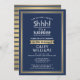 Você pode guardar um segredo? Convide familiares e amigos para uma elegante e excitante celebração de aniversário surpresa com convites de festas marinhos azuis e dourados. Toda a redação desta modelo é simples de personalizar, incluindo a mensagem que diz "Shhh! É uma SURPRESA." O design apresenta uma fronteira striped moderna, uma típica tipografia vintage art deco e uma caligrafia na moda. Observe que o ouro é impresso a cor, não a folha metálica. Este cartão pode ser personalizado para qualquer ano ou tipo de evento e é adequado para um homem ou uma mulher. Feliz Aniversário!