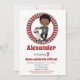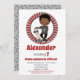 O convite de aniversário deste rapaz mostra um rapaz negro fofo com o skate. Em cinzas legal e fundo vermelho.