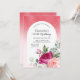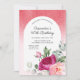 O convite de aniversário elegante apresenta uma flor de rosa de aquarela vibrante com verde-claro num fundo em forma de arco com brilho vermelho. Convidado ideal para a festa temática de aniversário da mulher e da mulher. Correspondência de Itens em nosso compro para um tema completo de festa.