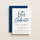 O moderno Vamos de script Celebra!, convite de aniversário. modelo marinho do estilo design de tipografia azul e preto-. A parte traseira da placa apresenta um padrão legal de rajada solar retrógrada em cores azuis de coordenação.