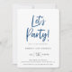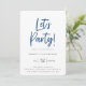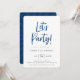 Moderno Vamos de script! Convite de aniversário. modelo de design de tipografia azul e Marinho de. A parte traseira da carta apresenta um padrão legal de rajadas retrógradas em cores azuis de coordenação.