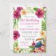 Elegante cor d'água, flores tropicais, cor-de-rosa e amarela, e folhas, moldadas com tucano e dourado confetti.