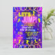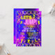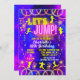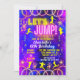 Vamos Salta Convite de aniversário com luzes vívidas néon brilhando em azul e roxo, e texto em cor-de-rosa, branca e amarela, excelente para um parque de trampolim ou festa de aniversário de casas de salto para meninas.