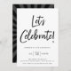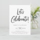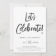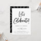 O Vamos de script moderno Celebra! convite de aniversário. modelo de design de tipografia preta. A parte traseira da placa apresenta um padrão legal de rajada de raios solares na coordenação de cores pretas e cinzas.
