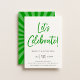 O Vamos de script moderno Celebra!, convite de aniversário. Modelo de design de tipografia verde e preta. A parte traseira da carta apresenta um padrão legal de rajada solar retrorreflectora na coordenação das cores verdes.