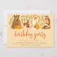 Celebre sua abóbora com nossos convites de aniversário para crianças! Apresentando lindos animais de floresta com aquarela, um urso segurando abóboras, um esquilo sentado sobre um cogumelo, uma raposa, uma coruja e um ouriço cercado de folhagem. "Festa de aniversário" aparece em uma fonte de script de pincel contra uma cor de fundo de pêssego suave. Seus detalhes são mostrados numa tipografia moderna. Este convite reverte para listras de cor de laranja correspondentes.
