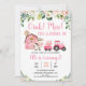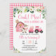 Fazenda doce, convite de aniversário temático para uma garotinha com alguns animais de fazenda e um arranjo rosa e floral. Este design também possui um celeiro e trator cor-de-rosa. Este convite temático da fazenda é uma maneira fofa de definir a cena para a festa de aniversário de uma menina temática fazenda.