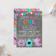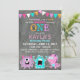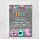 Pequenos monstros bonitos e assustadores em fundo de chalkboard com cartão de design de aniversário colorido de stripe verde.
