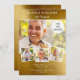 Crie sua própria colagem de fotos exclusiva. Use quatro, quatro das suas fotos favoritas. Personalize e adicione um nome e detalhes da parte. Um fundo de aparência falsa de ouro, texto branco.