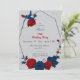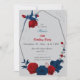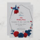 flores vermelhas românticas e azuis marinhos em moldura geométrica de cinza prateada contra convite de aniversário de cinzas