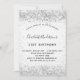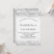 Um convite para uma elegante festa de aniversário 21 (ou qualquer idade). Um fundo branco chic na frente. Decorado com falso brilho prateado. Personalize e adicione um nome e detalhes da parte. O nome é escrito com um script de estilo manuscrito. Fundo: falso prateado olhando fundo com brilhos.