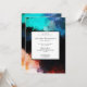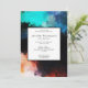Um convite de aniversário com visual artístico moderno. Criado com um design abstrato criativo. Salpicos de tinta e cores giratórias em turquesa, branco, laranja e preto com toques de azul.