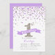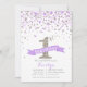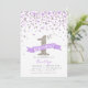 Espelhos cintilantes e pontos esparramados de lavanda sobre o cartão de convite de aniversário elegante de fundo branco.