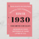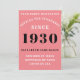 Para aqueles nasceres em 1930 e celebrando a sua festa de aniversário, temos o cartão de convite de aniversário ideal. O fundo cor-de-rosa com um design branco e preto é simples e, no entanto, elegante. Personalize facilmente o texto na frente e na parte traseira deste cartão de convite de aniversário usando o modelo fornecido. Parte da gama de padrões de configuração de cartões, suprimentos para festas e presentes.