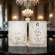 Anuncie sua união eterna com um toque celestial. Este design inspirado na era vitoriana apresenta rosas românticas, querubins e pombas para uma estética verdadeiramente atemporal. Este design captura a essência de um romance do século XIX. A obra de arte apresenta um fundo suave de céu nublado em azul pálido e branco, sobreposto por rosas cor-de-rosa exuberantes e um ícone detalhado da silhueta dos noivos. Um querubim central toca violino enquanto pombas brancas voam entre as nuvens. A borda utiliza um efeito de relevo 3D falso impresso para simular a aparência de ornamentos antigos e molduras arquitetônicas, emoldurando a caligrafia preta elegante e a tipografia serifada formal. Esta é uma imagem impressa plana com um efeito de textura simulado, não material em relevo realçado ou folha de ouro.