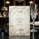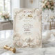 Anuncie sua união sagrada com a grandiosidade eterna do Renascimento. Este design apresenta estética celestial e flores luxuriantes para um tom verdadeiramente romântico. Uma composição visual intrincada inspirada na arquitetura clássica europeia. O design apresenta um efeito de relevo escultural falso, simulando a aparência de pedra talhada e moldura arquitetônica em tons de champanhe suave e bege. Uma vinheta central apresenta uma ilustração delicada de um querubim tocando violino, acompanhado por pombas brancas em voo e aglomerados luxuriantes de rosas creme e rosa. O fundo imita uma superfície de mármore texturizada, enquanto a tipografia simula o brilho de folha de ouro. Esta é uma imagem impressa plana com efeito de pedra e ouro falso, não material realçado, relevo ou folha metálica.