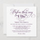 Convite elegante e sofisticado para a festa de boas-vindas do casamento para dar início ao fim de semana do casamento, apresenta um título em caligrafia: Antes de dizerem "Sim". Design quadrado. Esquema de cores roxo berinjela e branco.